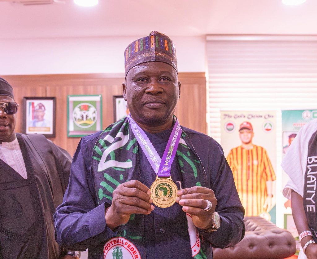 Governor Fintiri displays the medal won by Coach Justin Madugu at the 2024 Women’s Africa Cup of Nations in Morocco… Photo: Photo: Posted on Facebook by Fintiri’s aide, Pius Iliya.